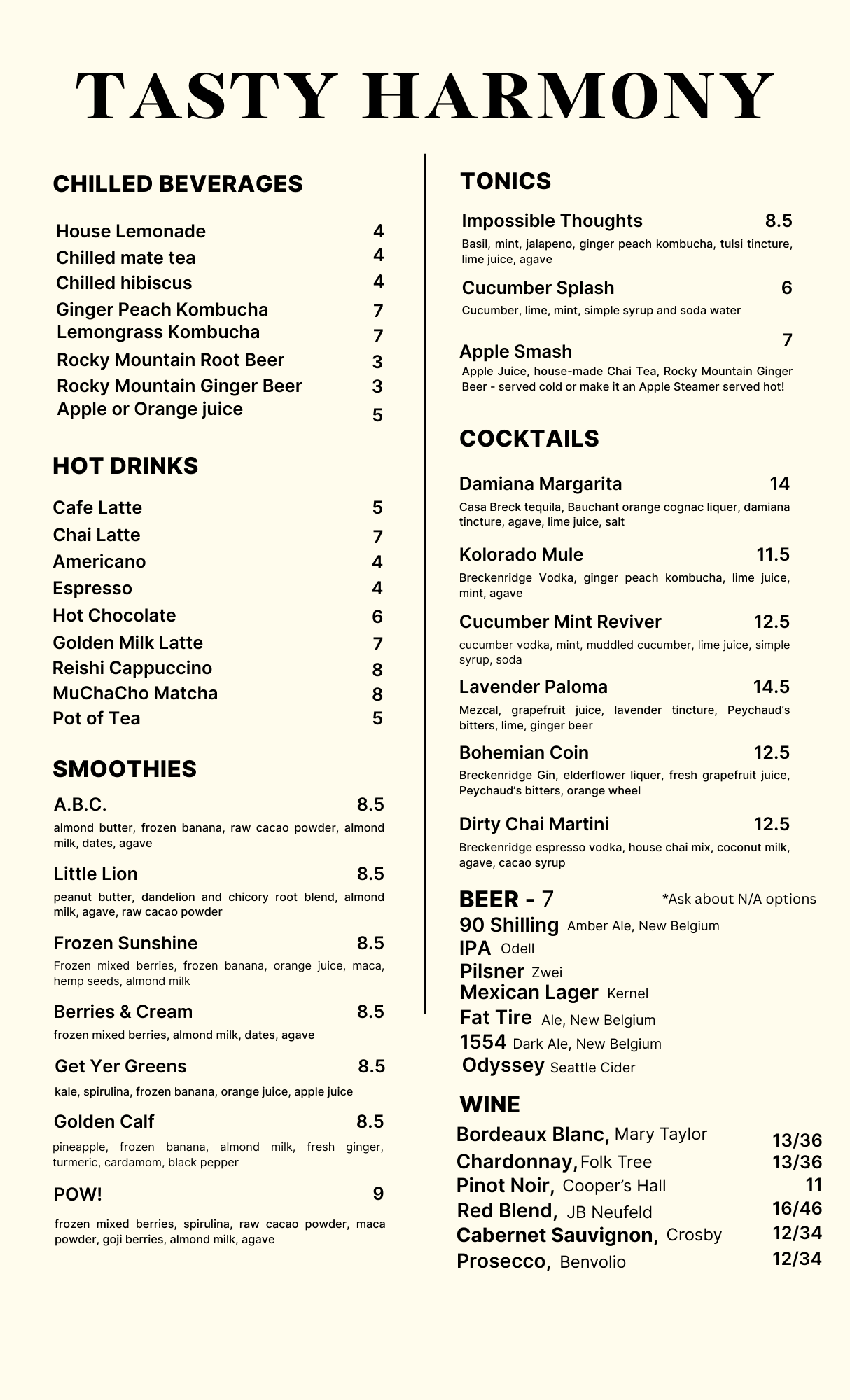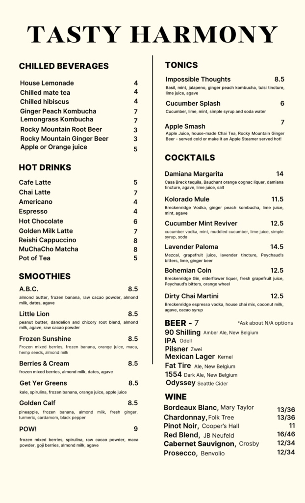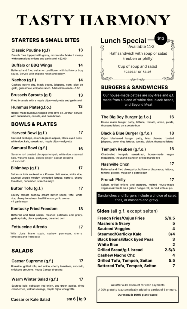 Tasty Harmony is committed to providing our community with healthy, creative, plant-based cuisine. MENU